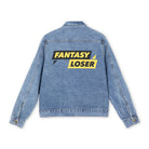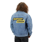 You won't be confused for a member of a biker gang anytime soon, but maybe your loser punishment will be to wear this jacket and matching mutton chops for a week for each loss you had this season. This classic denim jacket for men features a lapel collar and button-front closure for a timeless look, and the back-width retro Fantasy Loser logo emblazened on the back will be your badge of loser honor. With convenient front slant pockets for draft notes or loser punishment accessories (fanny pack is a perfect match for this jacket), it's as functional as it is fashionable. Sporting a medium denim wash, it pairs effortlessly with any outfit, just as you effortlessly failed to update your lineup when Sunday morning inactives were announced, adding a touch of rugged charm to your last place wardrobe.